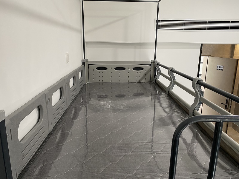 項目目前進展順利,一至三層樓正在進場安裝,宿舍房間明亮整潔,配置兩連體中梯公寓床,上有新款護欄加蚊帳桿,下有七字書桌配超大儲物柜,給員工創造獨立的私人空間。公寓床色調與宿舍裝修風格相協調,床體采用黑白灰設計,配色高雅,房間整體布局舒適溫馨。