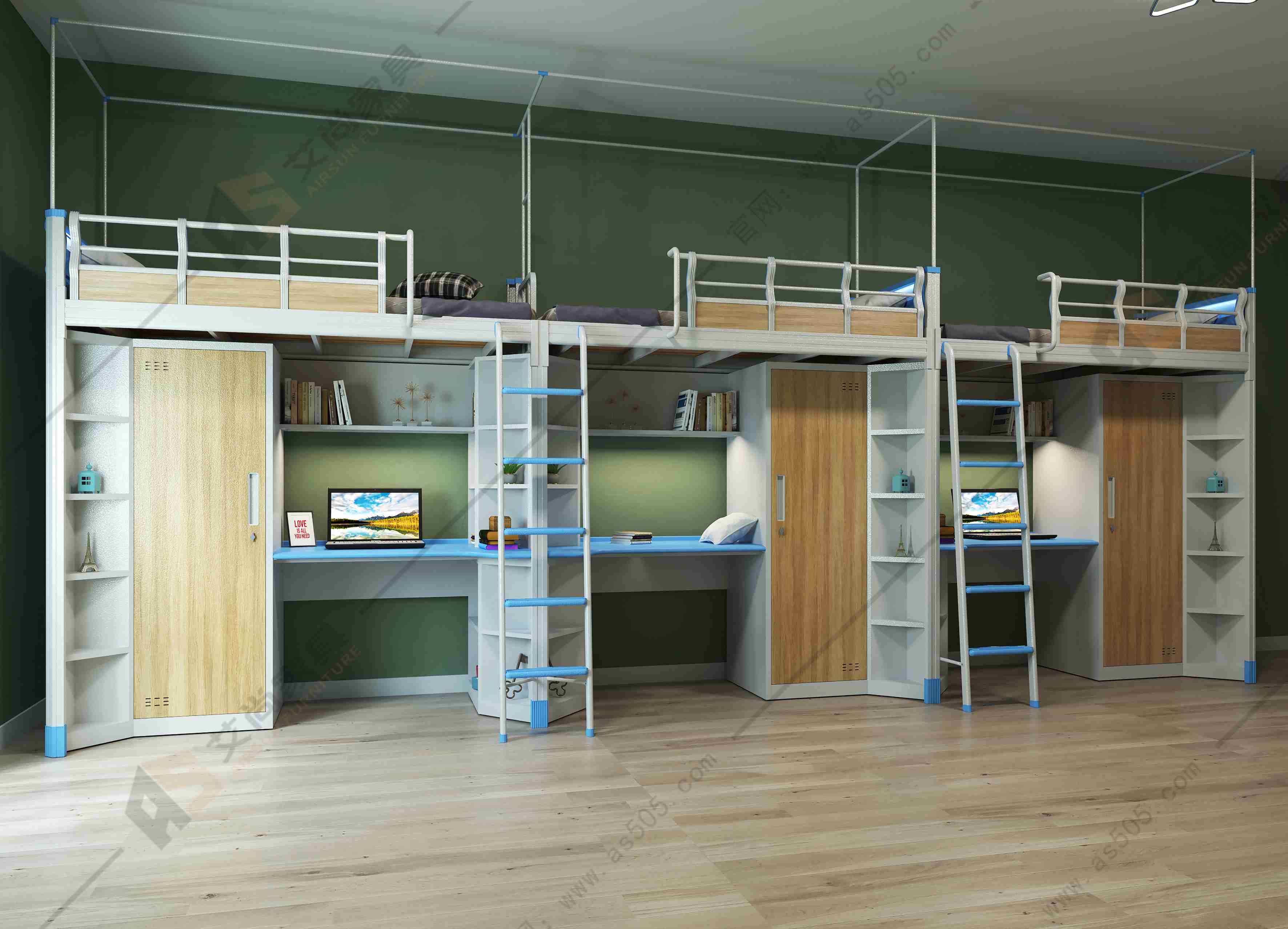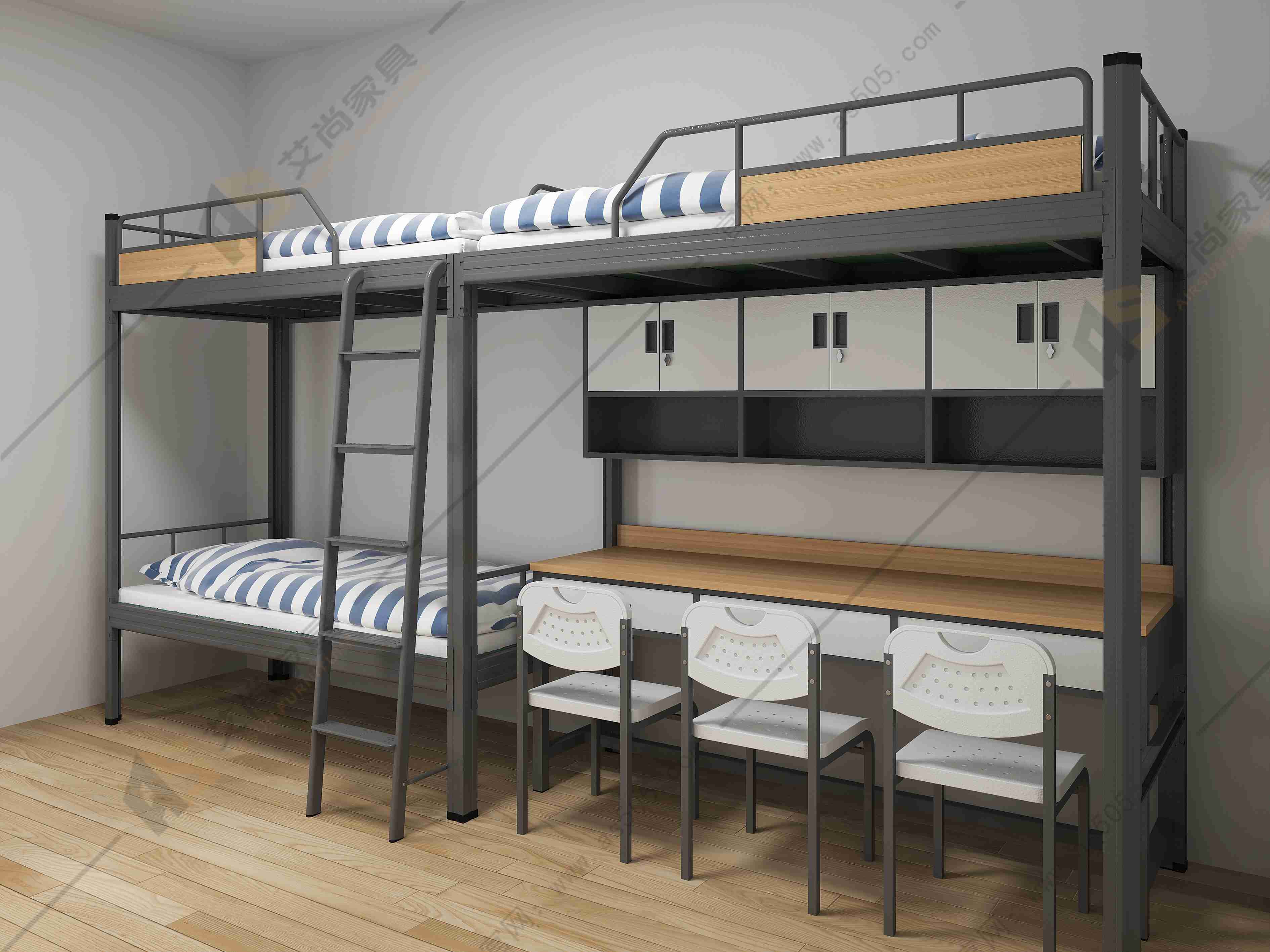 它由床、書柜、衣柜、書桌和梯架組成。書柜和衣柜連接在床架床腿內(nèi)側(cè),書桌將書柜、衣柜連在一起,床架有書柜的一頭安裝有梯架,床架的另一頭與梯架同側(cè)有護(hù)欄,上方睡覺(jué),下方辦公+收納,生活和學(xué)習(xí)分區(qū)。由于床是立體空間組合,不僅節(jié)省了宿舍的空間,而且使宿舍整齊美觀,又便于學(xué)校的管理。