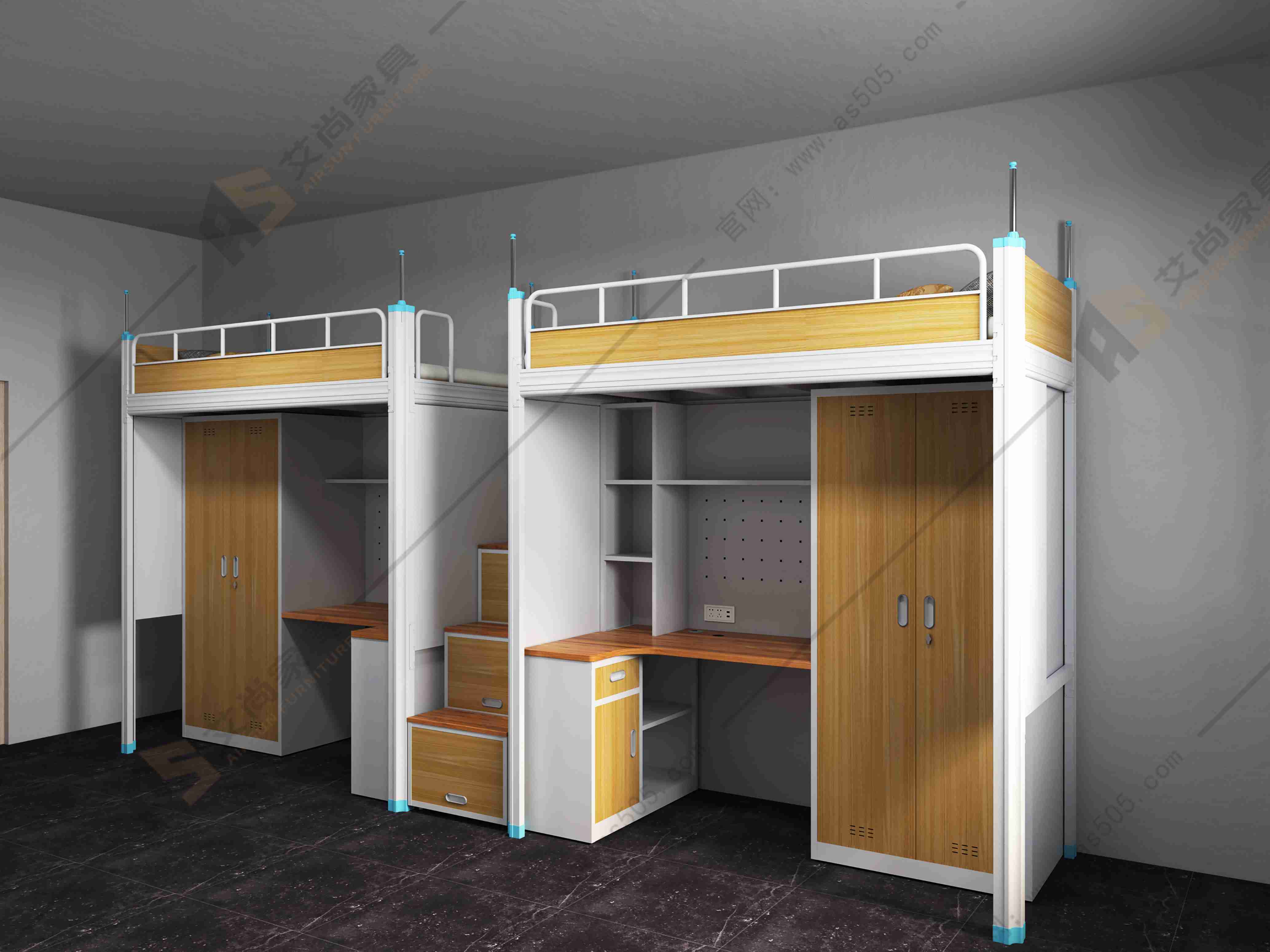 宿舍公寓床可根據您的需求定制衣柜、儲物柜、書柜等,還可配置密碼鎖,鑰匙鎖等,還可定制可調節的梯子,按房間擺放位置。和房間設計布局來改變梯子位置。