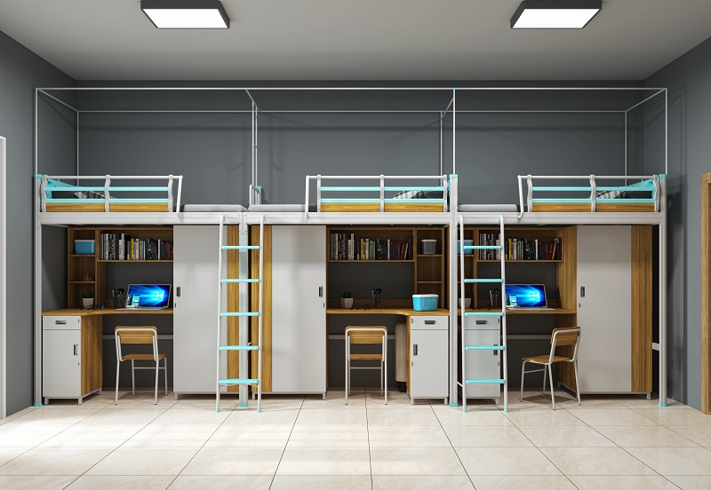 暑期過后,大一新學生就會步入大學校園,開始大學的宿舍生活。大學宿舍公寓床所擁有的床、桌、椅的組合可以緩和同學一天的疲勞,讓每個學生都有一個快樂的心情,大容量儲物柜更實用,使日常用品整理更容易。一瞬間,整個宿舍干凈、整潔、美麗。