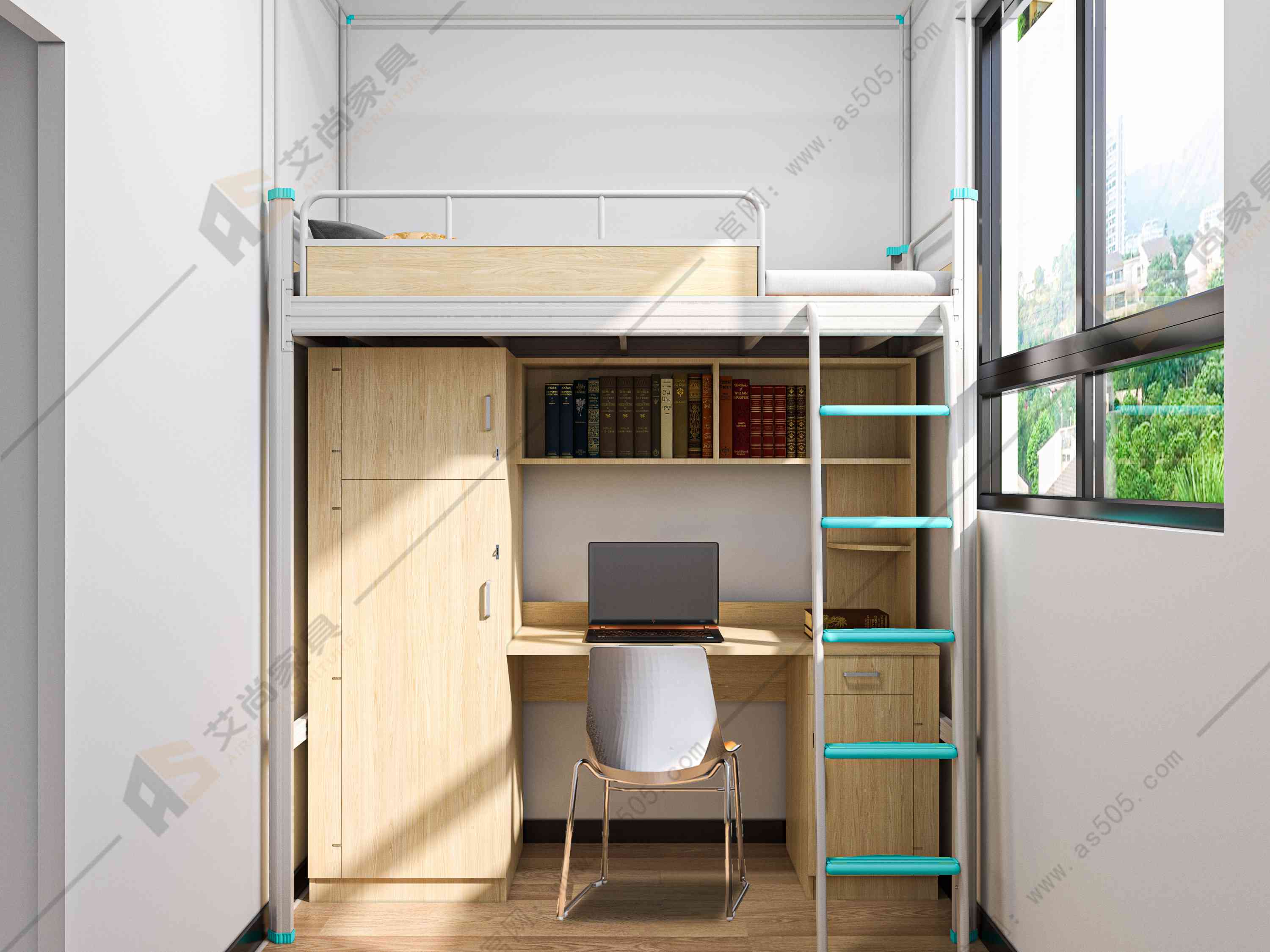 2. 多功能性:艾尚家具學生公寓組合床設計考慮到學生的多種需求,床架上通常配備了書桌、衣柜、書架等功能。這樣,學生可以在同一個床上完成睡眠、學習和儲物等多項活動,提高了宿舍的使用效率。