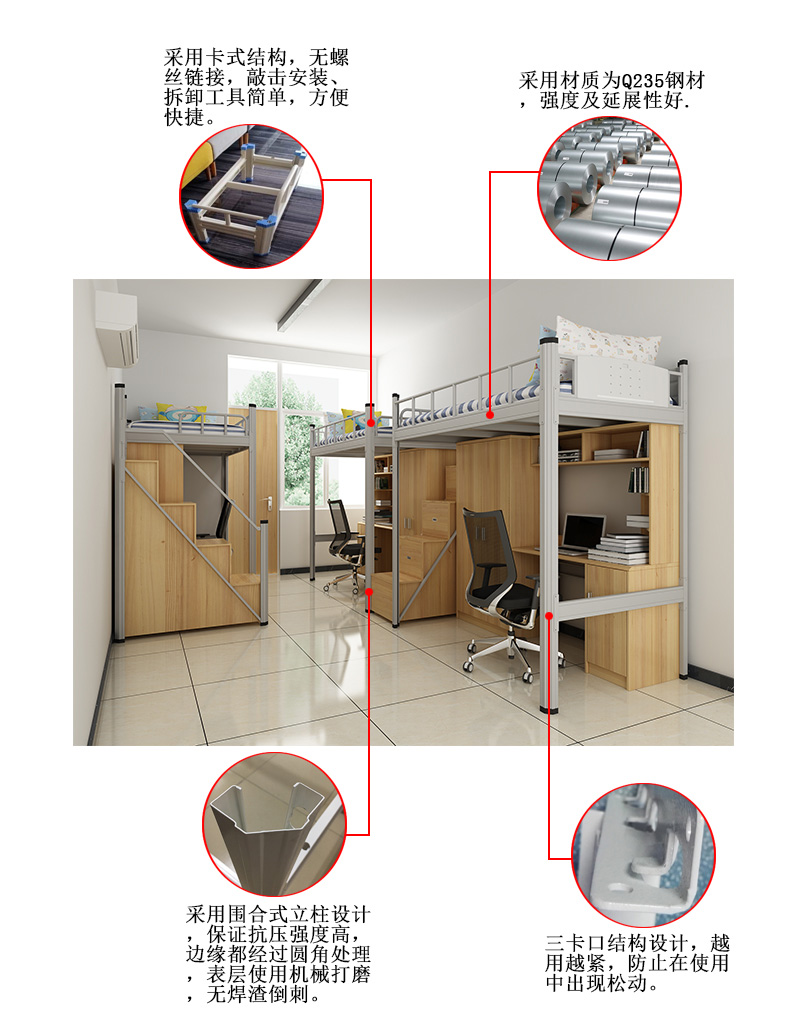 產品介紹: 兩連體中梯雙人位企業公寓床,產品常規尺寸4480長900寬2100高mm(可按照客戶宿舍需求定制尺寸),產品整體顏色:白色床架搭配木紋黃柜子(可根據客戶喜好定制顏色),床架:原材料采用優質冷軋鋼板經特制成型線軋制而成,材料厚度為1.2mm(國標)床體承重500-1000kg!產品采用紙箱包裝減少運輸途中受損,產品主要適用于企業、工廠、學校4人間宿舍,本產品質保十年!