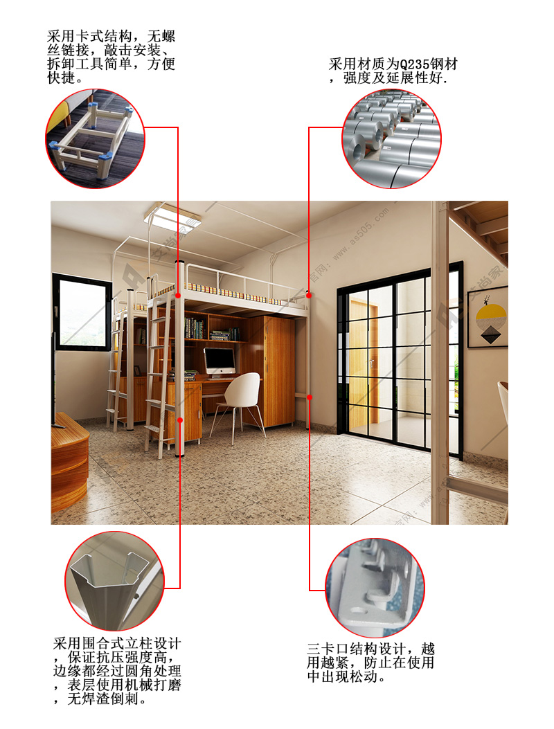 公寓床表面全自動噴粉處理,0甲醛;中空異型結(jié)構(gòu),卡扣式連接、無螺絲;