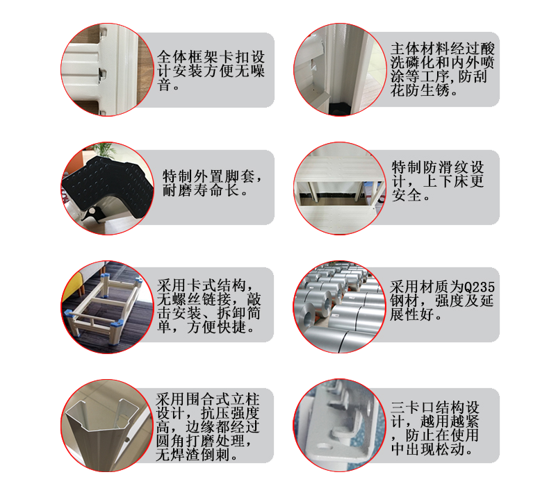 雙層鐵床表面全自動噴粉處理,0甲醛;中空異型結(jié)構(gòu),卡扣式連接、無螺絲;100%冷軋鋼板不參假。真正的良心企業(yè)!